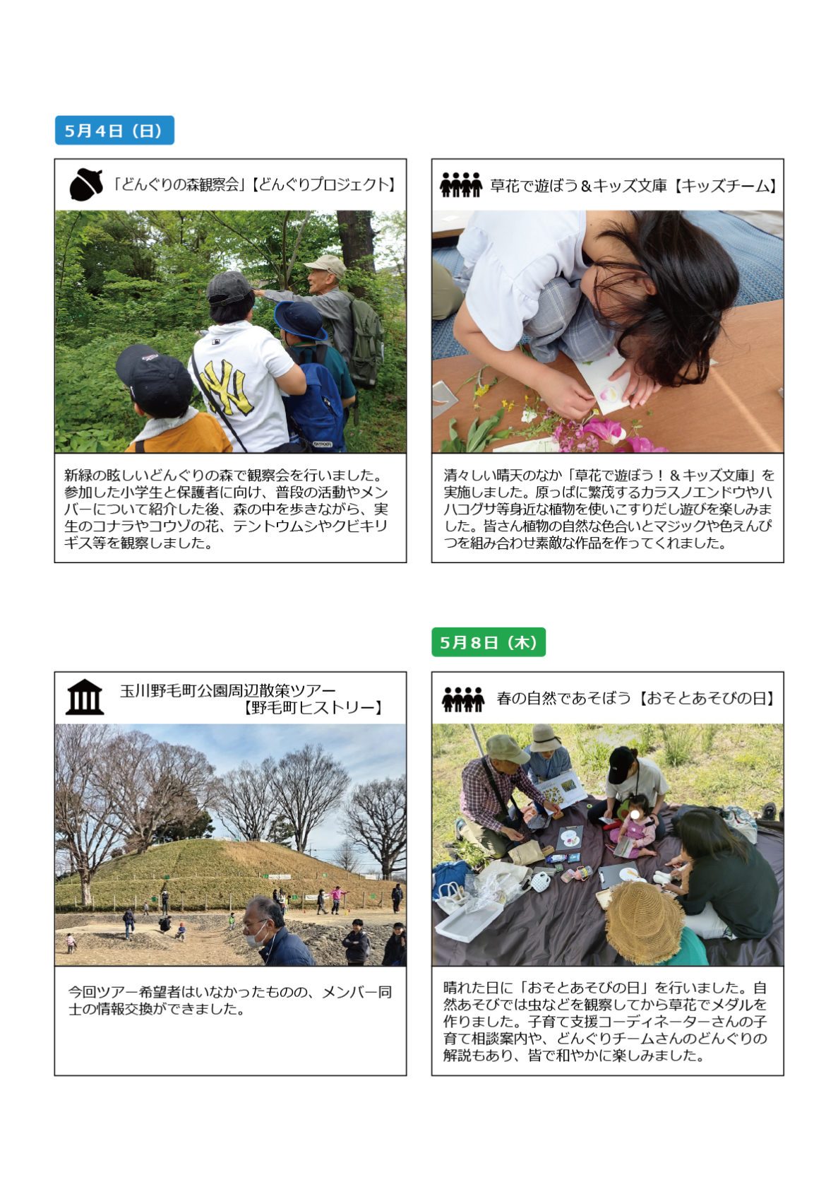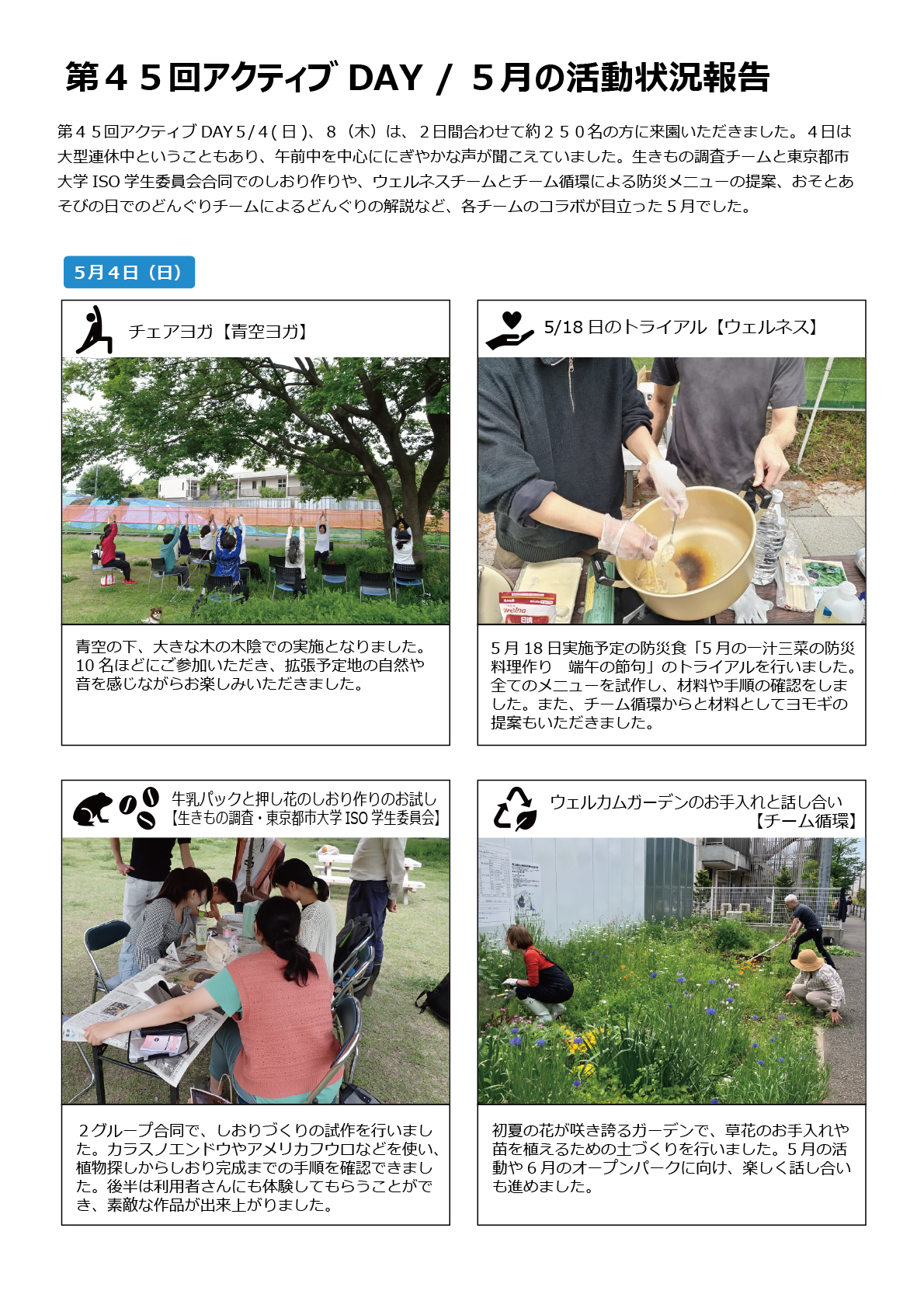 第45回アクティブDAY5/4(日)、8(木)は、2日間合わせて約250名の方に来園いただきました。4日は大型連休中ということもあり、午前中を中心ににぎやかな声が聞こえていました。生きもの調査チームと東京都市大学ISO学生委員会合同でのしおり作りや、ウェルネスチームとチーム循環による防災メニューの提案、おそとあそびの日でのどんぐりチームによるどんぐりの解説など、各チームのコラボが目立った5月でした。