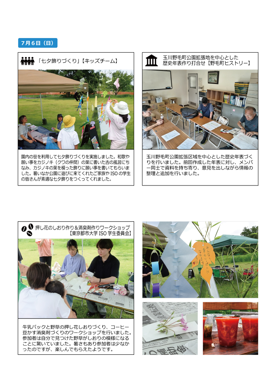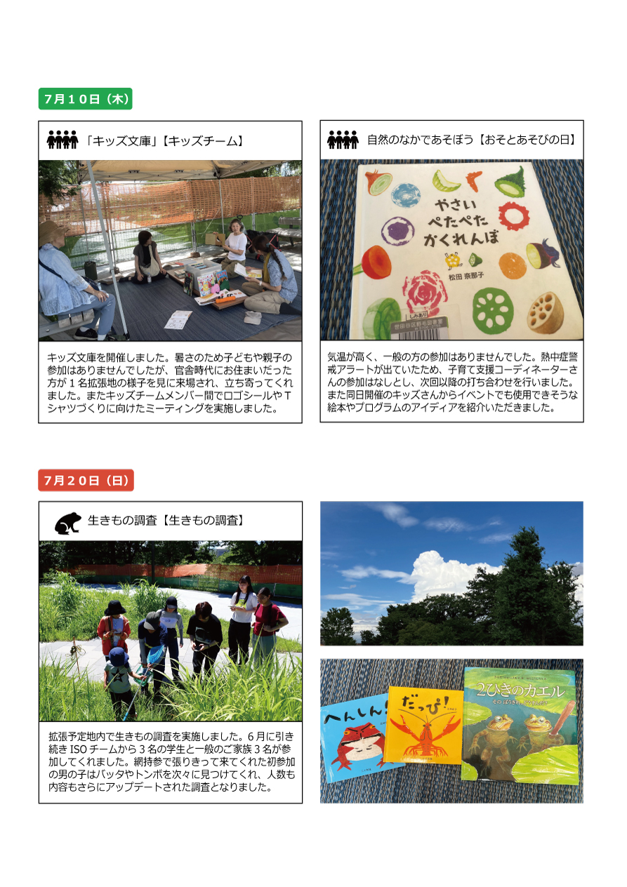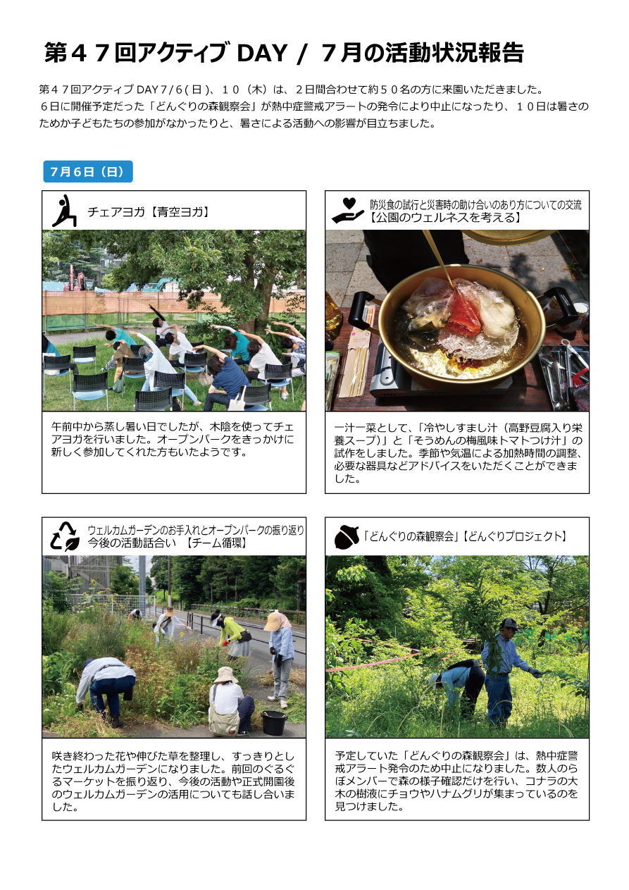 6日に開催予定だった「どんぐりの森観察会」が熱中症警戒アラートの発令により中止になったり、10日は子どもたちの参加がなかったりと、暑さによる活動への影響が目立ちました。