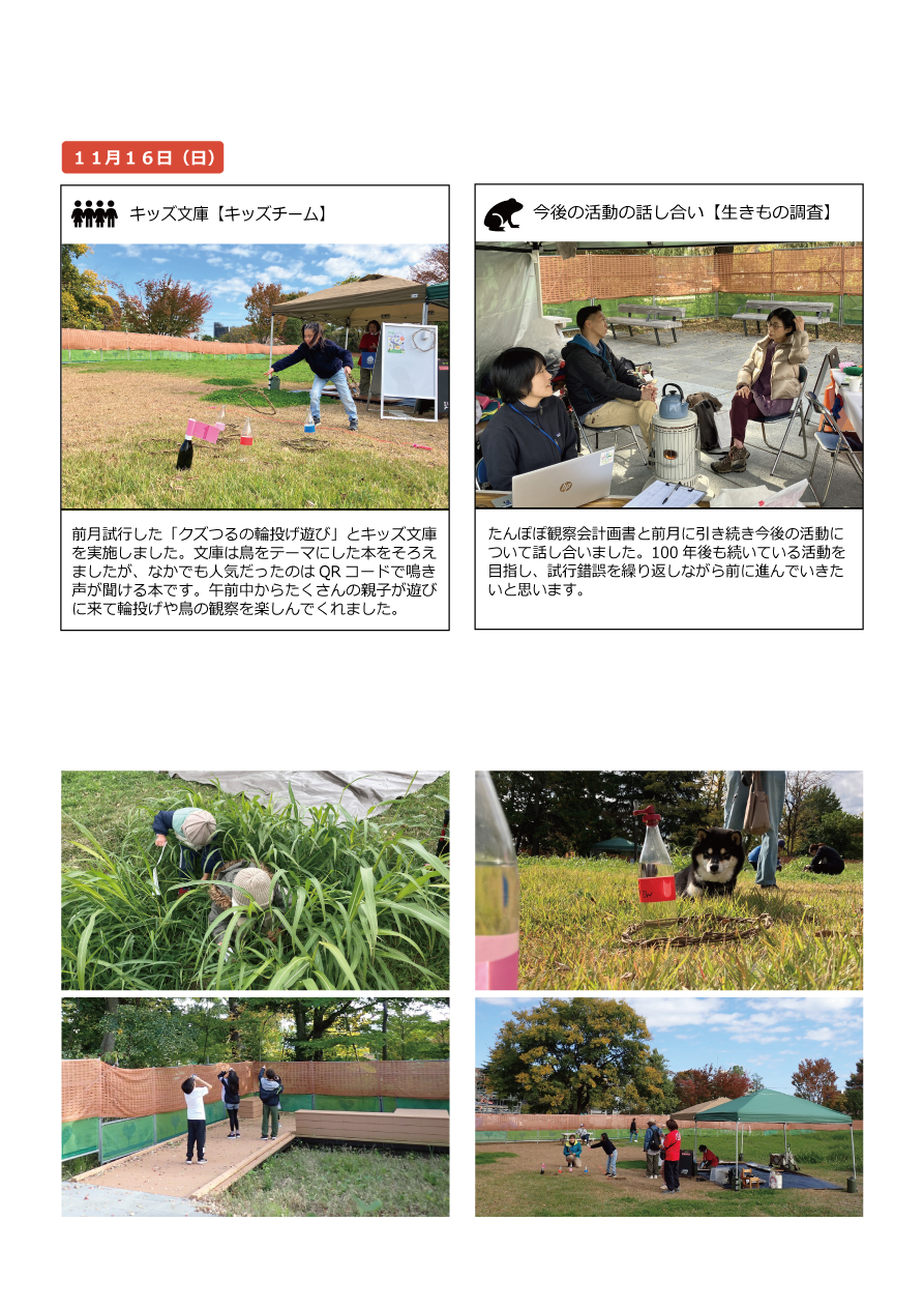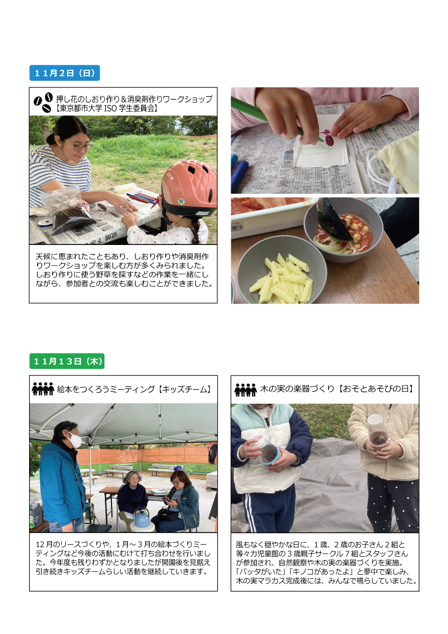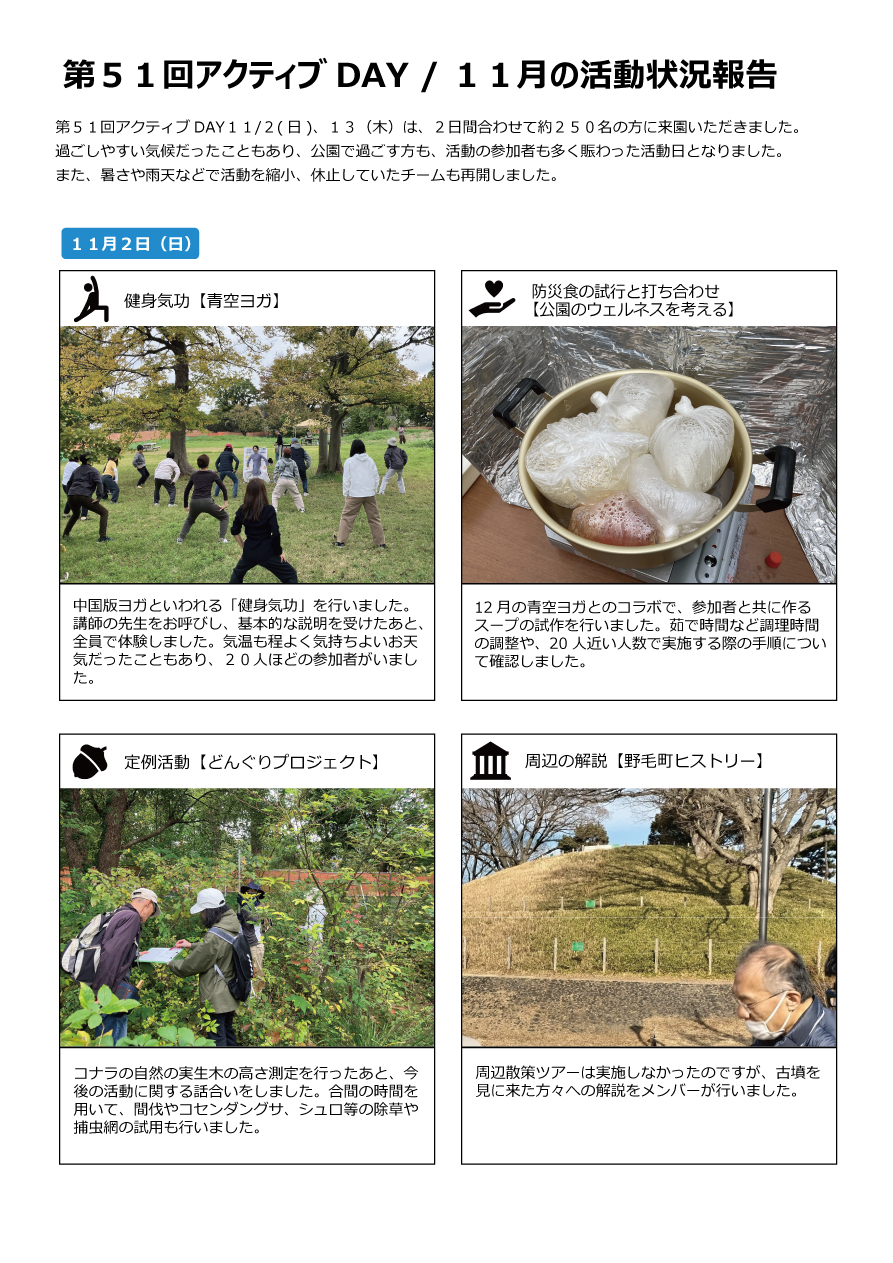 第51回アクティブDAY11/2(日)、13(木)は、2日間合わせて約250名の方に来園いただきました。過ごしやすい気候だったこともあり、公園で過ごす方も、活動の参加者も多く賑わった活動日となりました。また、暑さや雨天などで活動を縮小、休止していたチームも再開しました。
