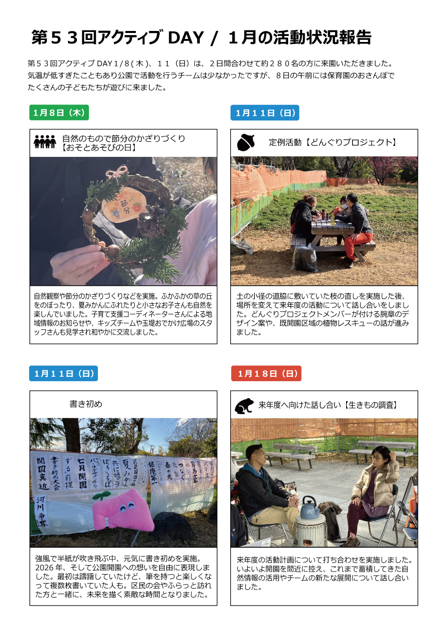 第53回アクティブDAY1/8( 木)、11(日)は、2日間合わせて約280名の方に来園いただきました。気温が低すぎたこともあり公園で活動を行うチームは少なかったですが、8日の午前には保育園のおさんぽでたくさんの子どもたちが遊びに来ました。