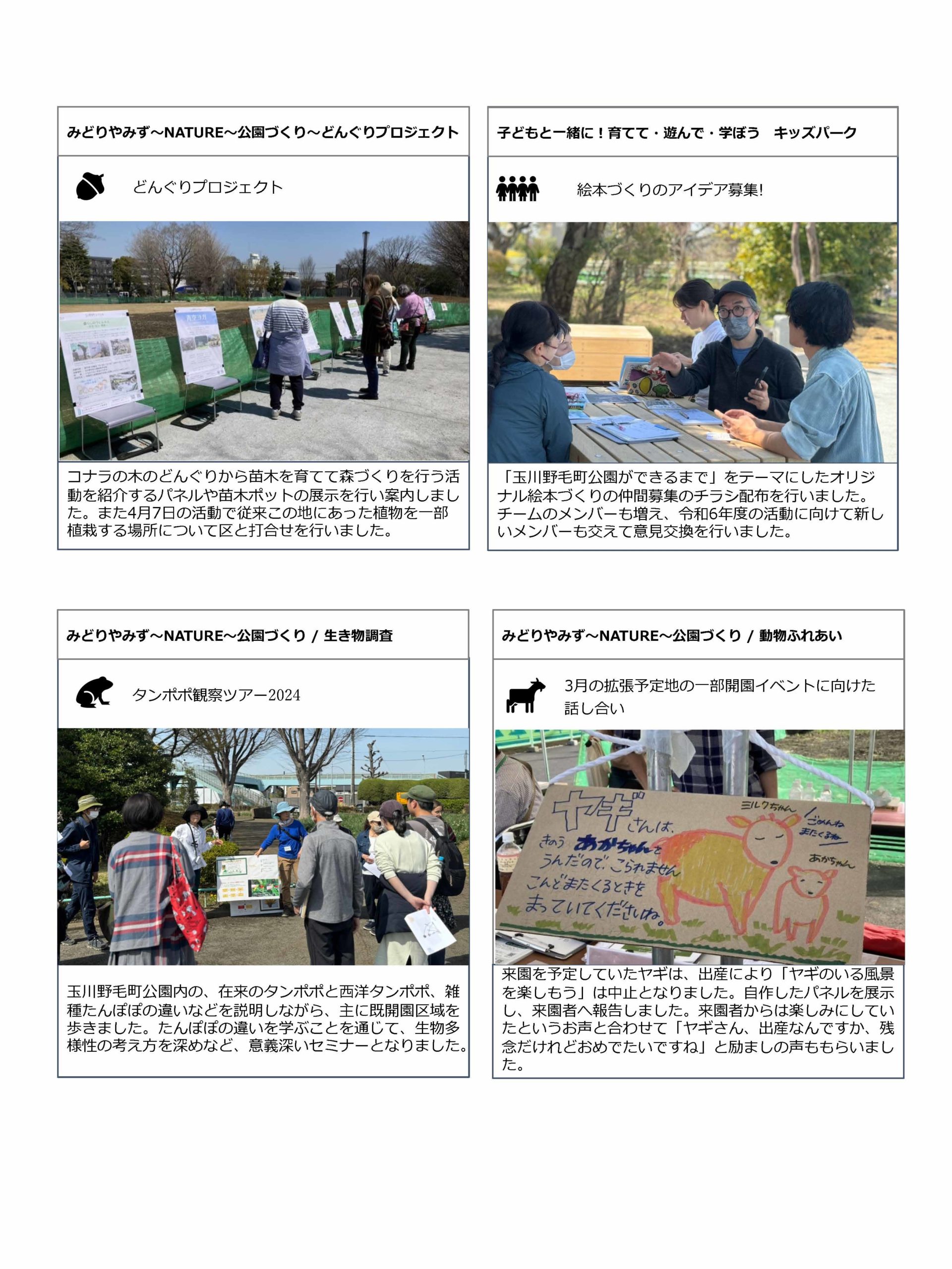 3/30(土)は、春の訪れを感じる温かな日差しの中で、一部開園イベントを開催し約700名の方に来場いただきました。区民主体の活動体験プログラムを実施し、各プロジェクトに分かれてパネル展示やそれぞれの活動を行いました。設計者とともに園路を巡り、設計意図を説明していくツアーや、「草地の広場」仕上げるために芝やクローバーなどの種をつけた土ダンゴをつくりたねまきを実施。また、「公園利用や活動の拠点となる施設(仮称パークらぼハウス)」の拠点で柔軟で多様な使い方ができる施設や家具の一部をご紹介しました。